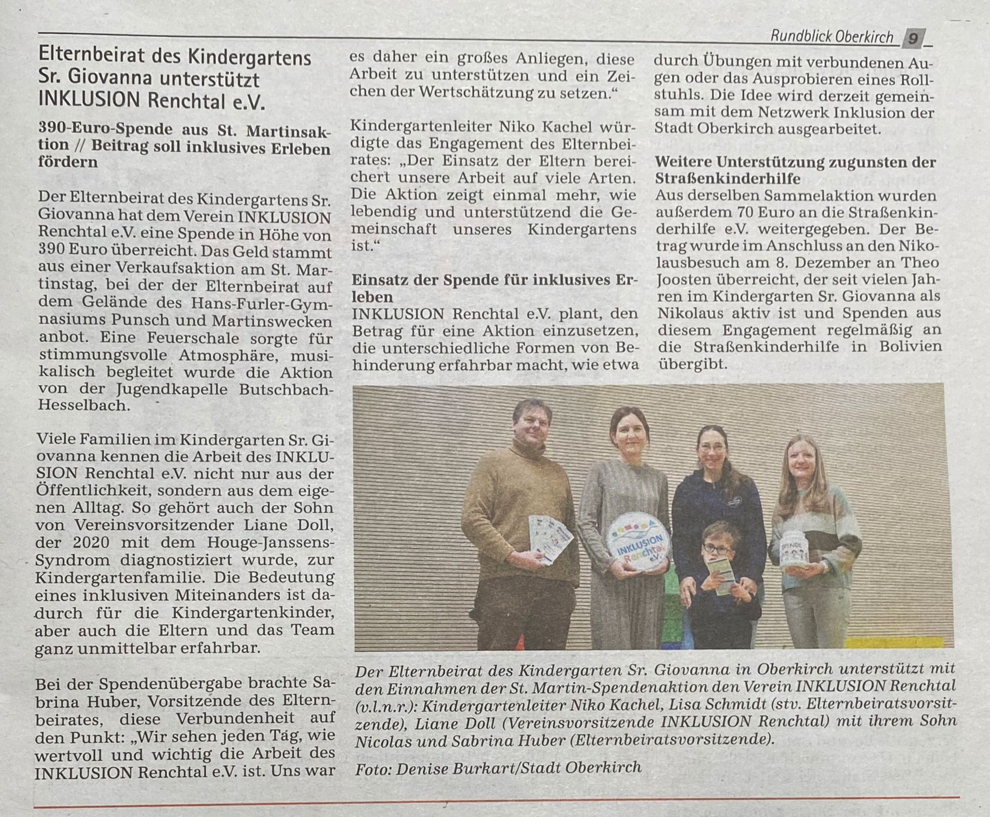 Bei der Spendenübergabe brachte es Sabrina Huber, Vorsitzende des Elternbeirates, auf den Punkt: „Wir sehen jeden Tag, wie wertvoll und wichtig die Arbeit des INKLUSION Renchtal e.V. ist. Uns war es daher ein großes Anliegen, diese Arbeit zu unterstützen und ein Zeichen der Wertschätzung zu setzen.“
